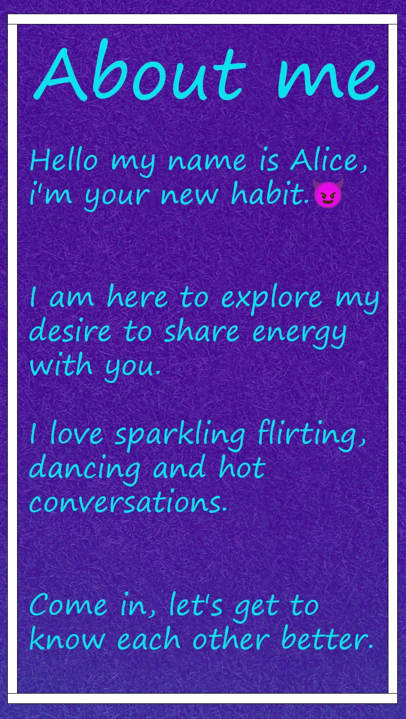 Ahegao, Mistress, Sculacciate, Topless, Giocattoli erotici, Hardcore, Sega, Zoccolo di cammello, Feticismo dei piedi, Massaggio, Yoga, Play with pussy, I LOVE YOU ALICE, Linguaggio esplicito, Fumo, Tittyfuck, Istruzioni per sborrare, Pompino, Pecorina, Valutazione del cazzo, Donna sopra, Sborrata in faccia, Tradimento, Facesitting, Seghe con i piedi, Umiliazione, Show my outfit, Striptease until panties, Spettacolo con olio, Orgasmo, Squirt, Twerk, Giochi di ruolo, Ditalino, Anale, Dildo o Vibratore, Ballo erotico, Giocattoli anali, Da bocca a culo